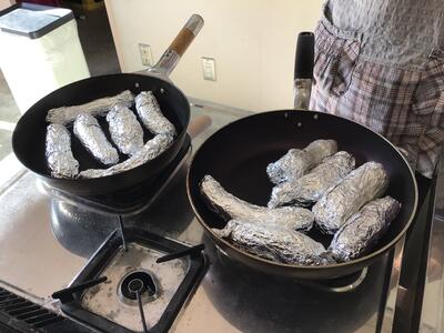 アルミホイルでくるんで、水をいれ、弱火で15分。ひっくり返して15分。