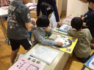 ワークショップでは、こまやメンコ、福笑いなど昔の遊びに夢中でした。