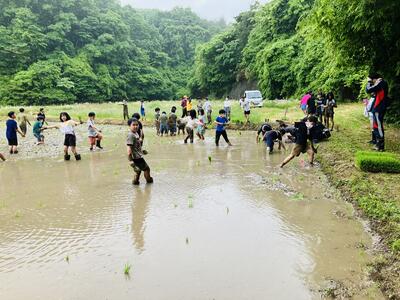 田んぼに入った瞬間、「きゃー!」「深い!」と大盛り上がりの子供たち。慣れてくるとどんどん植え始め、泥だらけになりながら最後まで頑張っていました。