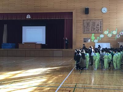 2月16日に音楽朝会を行いました。曲名は「世界が一つになるまで」です。とても心が温かくなる歌詞です。各クラスでも練習をして、本番は体育館に美しい歌声が響きました。