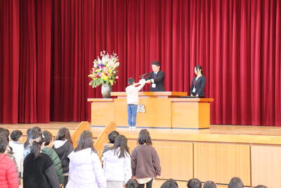 修了式では、各学年の代表児童1名が校長先生から修了書を受け取り、別の代表児童が今年度を振り返った作文発表をしました。1年の締めくくりにふさわしく、堂々とした態度でした。