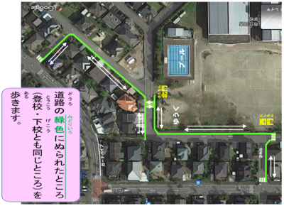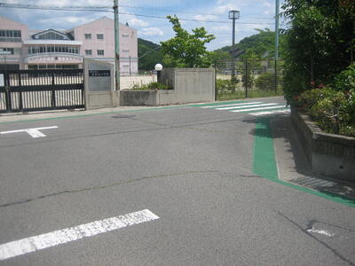 登下校時の交通安全対策として,学校周辺の通学路のカラーアスファルト工事が完了しました。道幅が狭く歩道のない道路で車の往来も多いことから富谷市に要望していたものです。緑色に塗装された歩道帯は,車を運転する方に減速や歩行者の確認を促すなど事故抑止に効果的です。