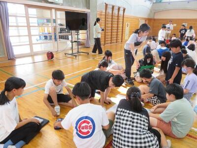 体育館で行われた長座体前屈、反復横跳び、立ち幅跳び、上体起こしのテストでは、どの子も去年の記録を少しでも更新できるように気合十分に取り組みました。テストの測定と記録、記録を伸ばすためのアドバイスを5年生のお姉さんお兄さんがしてくれました。
